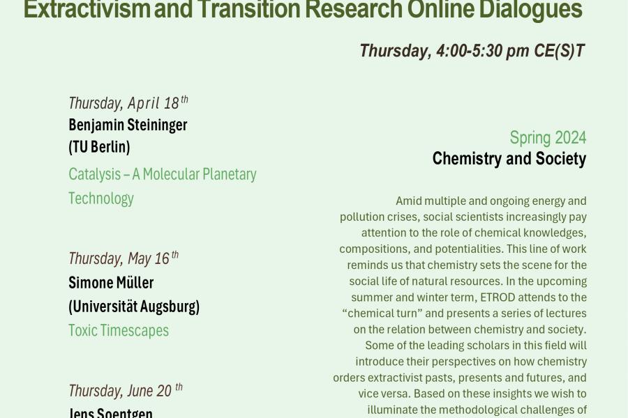 Amid multiple and ongoing energy and pollution crises, social scientists increasingly pay attention to the role of chemical knowledges, compositions, and potentialities. This line of work reminds us that chemistry sets the scene for the social life of natural resources. In the upcoming summer and winter term, ETROD attends to the “chemical turn” and presents a series of lectures on the relation between chemistry and society. Some of the leading scholars in this field will introduce their perspectives on how chemistry orders extractivist pasts, presents and futures, and vice versa. Based on these insights we wish to illuminate the methodological challenges of researching the often unseeable, the conceptual potentials of thinking with chemistry, and the political and ethical implications of life-as-chemistry.